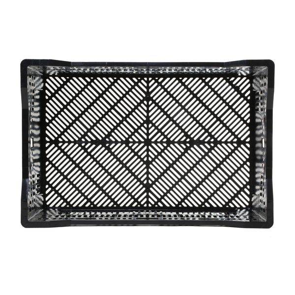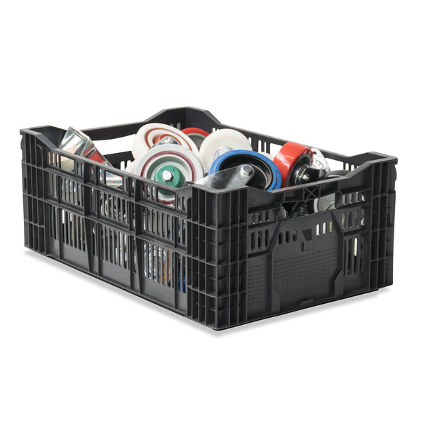 Euronorm stapelbak gemaakt van gerecycled HDPE materiaal. De buitenafmetingen van deze krat zijn 600x400x240 mm en de binnenafmetingen bedragen 566x367x224 mm. Het eigen gewicht is 1,65 kg en het volume 46 liter. De zwarte Eurokrat is voorzien van twee open handgrepen voor optimaal ergonomisch gemakt. De maximale draaglast is 40 kg.